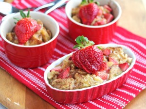 1.Preheat oven to 375 degrees. Lightly grease a small baking dish or individual ramekins with spray oil. Place cubed bread in baking dish(es). Mix mashed banana, strawberries, milk, eggs, cinnamon and vanilla together in a medium bowl. Pour milk mixture over bread cubes and toss gently until bread is evenly coated.