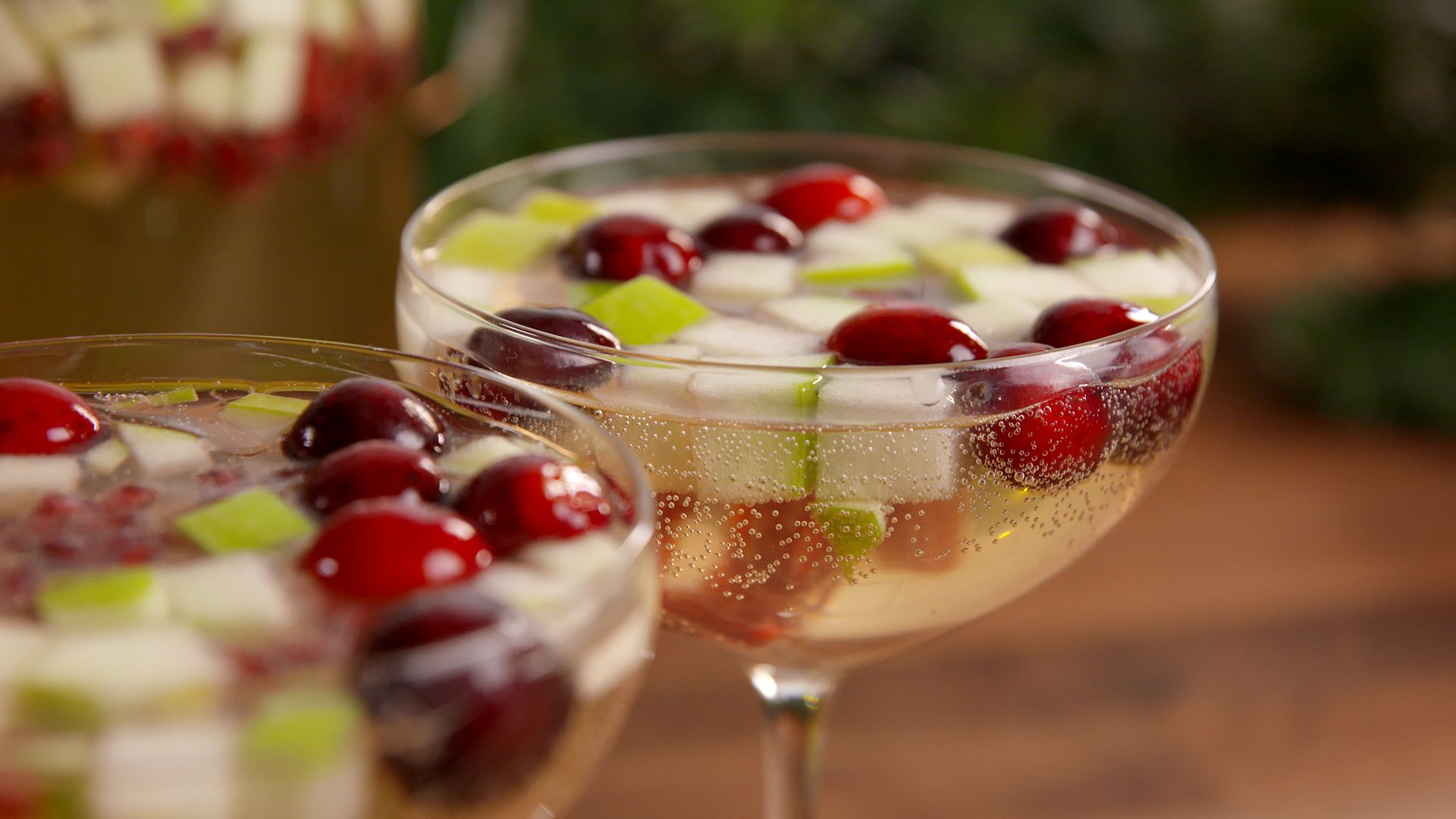 In a large pitcher or punch bowl, add apples, cranberries, grapes, and pomegranate seeds. Pour over sparkling grape juice and champagne just before serving.
