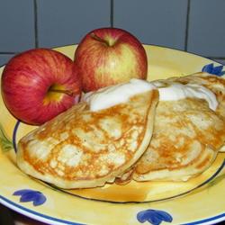 In a large bowl, stir together the eggs, milk, yogurt and oil until well blended. Combine the flour, baking powder, baking soda, salt and cinnamon, stir into the milk mixture until smooth. Fold in chopped apple.