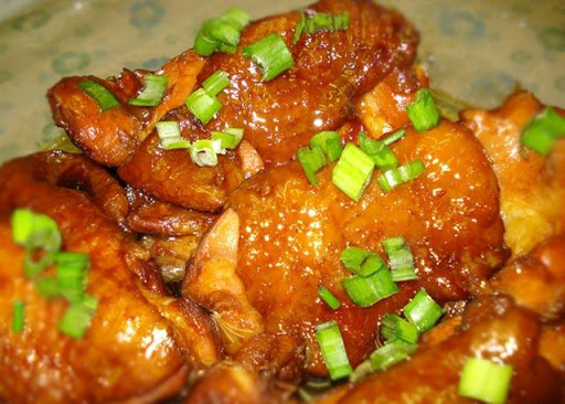 During cooking time, turn the chicken over several times until evenly browned. Thinly slice the tops of the green onion. Reserve it as a garnish. Transfer the chicken pieces to a serving bowl. Skim off the grease from the sauce in the pot and discard the garlic and ginger. Pour the sauce over the chicken. Garnish with green onions. Serve hot with scoops of steamed white rice.