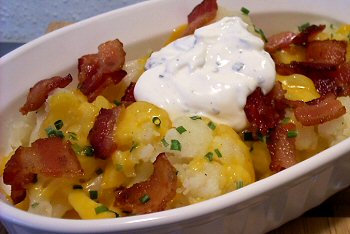 Butter and season the cauliflower. Place in an individual-serving baking dish, then top with the cheese. Microwave or broil until the cheese is melted. Top with ranch dressing, bacon and chives.