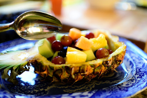 Spoon the fruit into both of the pineapple shells, pouring on a little more dressing if there's some left in the bowl. Garnish with mint leaves and serve!