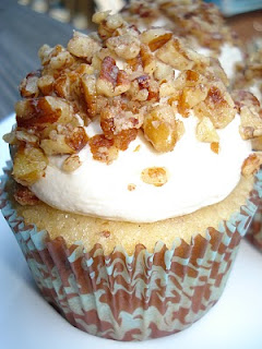 In a large mixing bowl, cream sugar and remaining cup of butter until light and fluffy. Add the eggs one at a time and mix thoroughly after each addition. Beat in vanilla. Add the dry mixture in thirds, alternating with the milk. Mix well after each addition. Stir in 1 1/3 cups of the toasted pecans. The remainder will be used to top the cupcakes.
