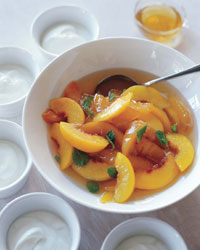 Meanwhile, using a sturdy vegetable peeler, peel the peaches; transfer the skins to a small saucepan. Add the water, sugar and mint sprigs and bring to a boil. Reduce the heat to moderately low and simmer for 10 minutes.