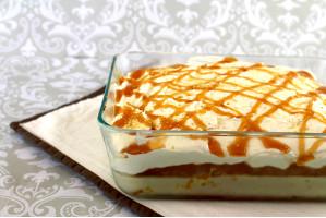 To serve, drizzle with caramel sundae sauce and garnish with graham cracker crumbs and chopped pecans.