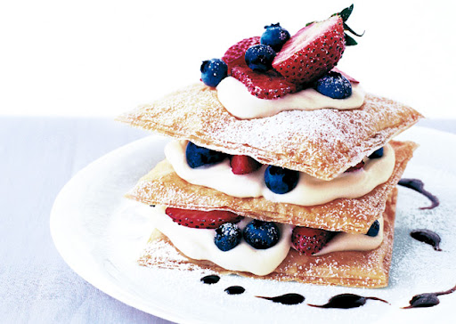 Spoon dollop of filling atop each napoleon. Garnish with reserved straw-berry slices and blueberries. Dust with powdered sugar. Place 1 napoleon in center of each plate. Drizzle balsamic reduction around edge of plates.