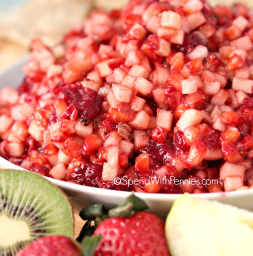 Finely chop strawberries and kiwis. Gently combine all ingredients, the raspberries will break apart a bit but that's what you want. Allow to sit at room temperature at least 15 minutes before serving.