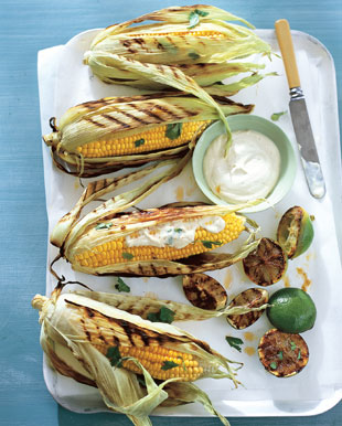 Pull husks away from corn to expose kernels. Place corn and lime on platter. Brush corn with crema-lime mixture. Sprinkle with cilantro.