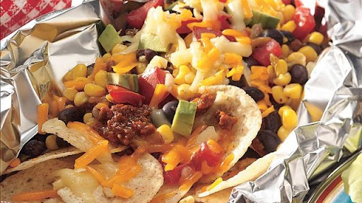 1. Heat grill. Cut four 18x12-inch sheets of heavy-duty foil; spray foil with nonstick cooking spray. Spread tortilla chips in center of each foil sheet.