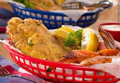 Cook catfish in batches 4 to 5 minutes per side, or until the coating is golden and the fish flakes easily with a fork. Drain on a paper towel-lined platter. Serve immediately with chips.