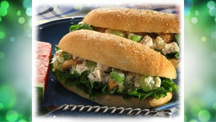 Combine mayonnaise and lemon juice. In a separate bowl, mix remaining ingredients, except cashews and lettuce. Pour mayonnaise mixture over chicken mixture and fold together. Salt and Pepper to taste. Allow to chill in refrigerator 1-2 hours. Just before serving, add cashews. Slice breadsticks and fill with lettuce and chicken salad.