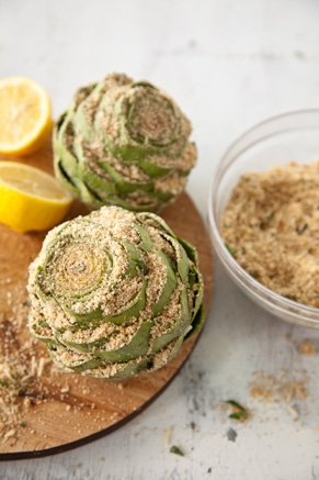 Cut off the stem of each artichoke, and then trim the tips of the leaves with kitchen shears. Open the leaves with your fingertips and rinse with cold water, holding the leaves open. Working with one at a time, place each artichoke in the center of the bowl of breadcrumb mixture and stuff the mixture into the leaves, holding the leaves open. You may have leftover stuffing, depending on the size of the artichokes. Sprinkle the tops of the artichokes with the juice from the remaining lemon half. Place a lemon slice on top of each artichoke.