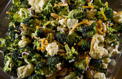 In large bowl, combine broccoli and cauliflower. Add onion and mix well. Add cheese and bacon.