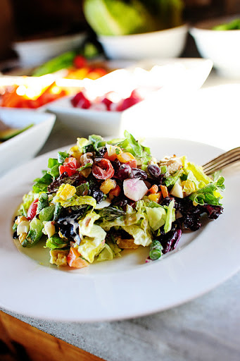 Have a big stainless bowl with tongs. Have everyone build their own salad by throwing what they want into the bowl. Toss with dressing.