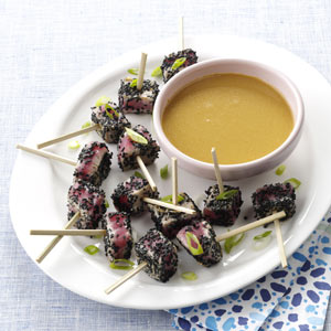 • On each of 30 wooden appetizer skewers, thread one tuna cube. Arrange on a serving platter. Garnish with onions. Serve with sauce.