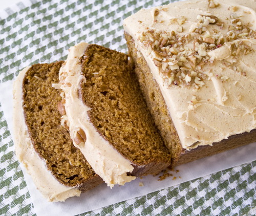 After frosting the cooled pumpkin loaf, sprinkle with chopped pecans or walnuts if desired.