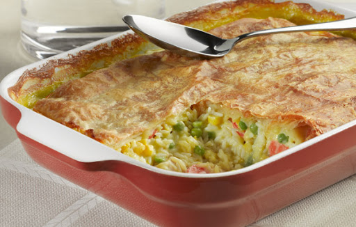 Uncover and top with puff pastry dough, and bake for another 20 minutes.