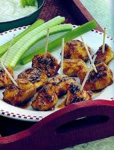 3. Add remaining half of chili sauce mixture; toss to coat. Serve chicken with toothpicks and blue cheese dressing for dipping.
