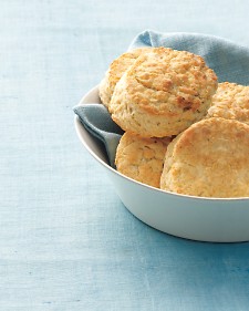 Turn dough out onto a lightly floured work surface and knead until it just comes together. With a floured rolling pin, roll out dough 3/4 inch thick. With a floured 2 3/4-inch biscuit cutter, cut out 16 rounds (reroll and cut scraps). Place biscuits, 1 1/2 inches apart, on a baking sheet and bake until puffed and golden, 13 to 15 minutes. Transfer to a wire rack and let cool slightly. Serve warm or at room temperature.