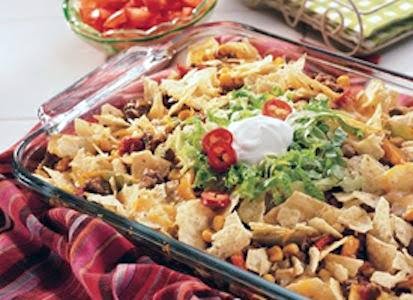 3. Spoon half of beef mixture evenly in bottom of baking dish. Cover with 2 cups of the chips. Sprinkle 3/4 cup of the cheese over chips. Spoon remaining half of beef mixture evenly over cheese. Sprinkle with 1 cup cheese. Top evenly with remaining 1 cup chips. Cover baking dish tightly with foil, sprayed side down. Refrigerate at least 4 hours or overnight.