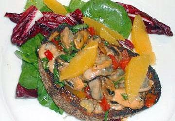 Combine the pepper mixture with the shucked mussels, the remaining oil, and the orange segments and juice. Refrigerate until ready to serve.