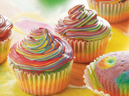 2 Make cake batter as directed on box for cupcakes, using water, oil and eggs. Divide batter evenly among 6 medium bowls. Add a different food color to each bowl to make red, orange, yellow, green, blue and purple. Place 1 level teaspoon of each color batter into each muffin cup, layering colors in order of rainbow—red, orange, yellow, green, blue and purple. Do not stir! Each cup will be about half full.