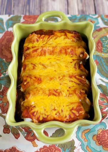 Spread approximately 1/4 cup meat mixture onto each tortilla; top with 2 Tbsp cheese. Roll up tortillas, place, seam side down, into 9x13 pan. Repeat with remaining tortillas. Pour enchilada sauce over tortillas. Sprinkle with remaining cheese.