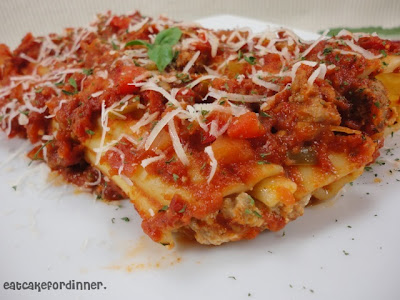 Stuff each cannelloni shell and place in a single layer in a greased baking dish. Top with remaining sauce and sprinkle with remaining Parmesan cheese.