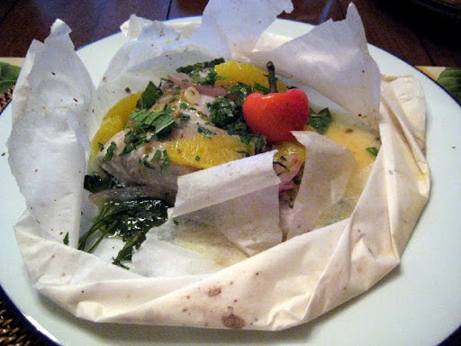 Cooking in paper almost always yields a perfectly cooked fish. For this recipe, use bluefish, mackerel, or some other high flavor oily fish, to properly balance out the other strong flavors that go in the "package."