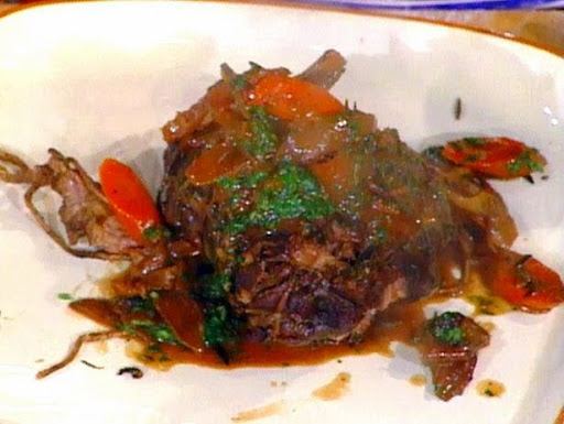 In a Dutch oven, heat the oil until just smoking. Brown the meat on all sides in the oil, remove and set aside. To the Dutch oven, add the onions, carrots, and apple and cook until light golden brown. Add the wine and rosemary, bring it to a boil, and return the meat to the pan. Lower to a simmer, cover, and cook until the meat is fork-tender (about 1.5 hours). Remove from the oven, remove meat and return Dutch oven to stove top to cook for 10 to 15 minutes more, until sauce is reduced. Garnish with the parsley, untie the meat and carve into slices to serve.