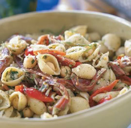 2. Bring a large pot of abundantly salted water to a boil and cook the conchiglie rigate. Five minutes before the pasta is al dente add the chickpeas. Drain well when the pasta is al dente.