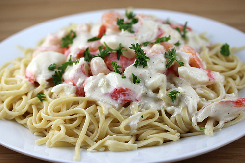 I love seafood pasta dishes and when you add more than one type of seafood into the dish, the result is even more amazing. This seafood pasta recipe consists of both imitation crab and cooked shrimp. The seafood is cooked in a white alfredo style sauce and then served over your favorite pasta. If you want you can use real crab meat in place of imitation crab. The recipe calls for small salad shrimp but I used medium shrimp. This is a very easy recipe to prepare and it does not take very long to cook at all. It goes great served with garlic bread. Enjoy.