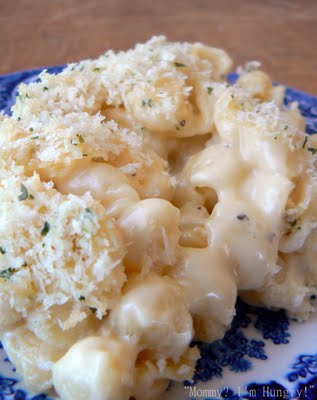 In a saucepan, melt 1/2 C butter, salt pepper, once melted add flour, stir until smooth. Let cook for 1 minute. Add milk, wine, bring to a boil, whisking. Add cheeses and stir until melted. Pour over cooked pasta and add to greased dish. Combine the panko, parsley and melted butter in a small bowl. Sprinkle macaroni with panko topping, bake uncovered 30 minutes.