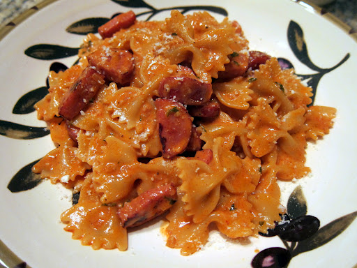 This was one of the best things we ate last week. It reminded me a lot of jambalaya (that's why I called it Creamy Jambalaya Pasta). I've never had a pasta with smoked sausage in it and it turns out that I love it! This dish had the perfect amount of spice in it - not too hot, but it definately had a little kick to it from the cajun seasoning.