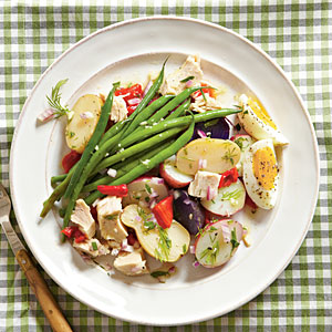 3. Gently stir together roasted red bell peppers, next 3 ingredients, potatoes, and beans. Whisk together garlic and next 6 ingredients; gently toss with potato mixture. Arrange on a serving plate with tuna and eggs.