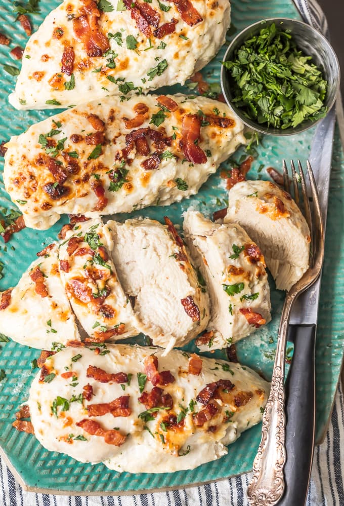 Remove from the oven and sprinkle with cooked bacon crumbles. Allow the chicken to rest a few minutes before serving.
