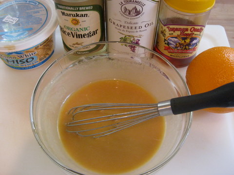 Mix the miso paste, vinegar, fresh orange juice and honey in a small bowl with a whisk until smooth, using a splash of hot water to help dissolve the miso paste. Slowly whisk in the grapeseed oil.