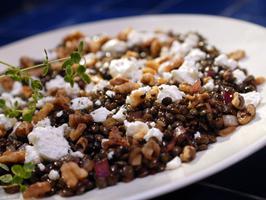 Meanwhile, heat the olive oil in a saute pan and fry the onion until soft. Add the garlic for 1 minute, then deglaze the pan with a splash of balsamic vinegar. Once the lentils are cooked, toss them with the onion mixture, season with salt and pepper and put them in a serving dish. Scatter over the nuts and pinches of cheese. Drizzle with walnut oil. Serve warm.