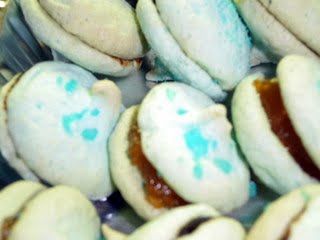 Sacar los merengues, y hacer los bocados, poniendo una cucharadita de mermelada en la parte que estaba en el papel. Hacer bocados con dos merengues.