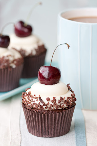 Frost the filled cupcakes with the whipped cream. (I used a pastry bag fitted with an Ateco #809 tip.) Garnish as desired with cherries and chocolate shavings. Refrigerate until ready to serve.