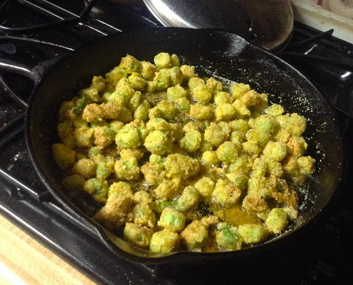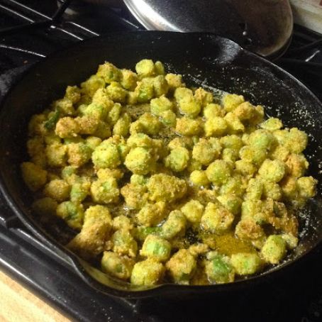 "I soaked the sliced okra in ice water with 2 tsp. salt for 30 min. Dumped it in a colander and rinsed it a little bit, then tossed it in a paper bag with seasoned cornmeal and shook it up. Fried it in HOT oil for just a few minutes."
