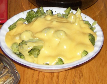Microwave the broccoli and water till hot and crisp-tender. Melt the rest of the ingredients in a saucepan or microwave. Stir with a wooden spoon until the cheese is melted and mixture is smooth. Drain broccoli and put it into a serving bowl. Pour hot cheese over broccoli. Makes 6 servings.