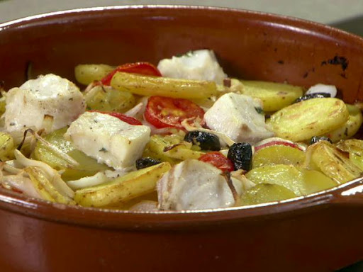 Boil the potato slices in salted water until they are not quite completely cooked, about 5 minutes. Drain and set aside. Grease a claypot or baking dish with the olive oil and place the fish in the dish.