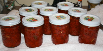 Put the pan on the heat and boil the mixture for 30 to 45 minutes. (The recipe says 30, but it’s always more.) It should thicken and look like the picture at left. (Be warned: Your house will stink like vinegar when you do this! Open the windows, because it’s worth it.) While the mixture is boiling, get out jars and lids, wash them, and put a huge pot of water on the boil. (If you’ve never canned before, check out this site.) Sterilize the jars. When the mixture is ready, spoon the relish into jars, wipe the tops, screw on the lids, and process for 10 minutes in a boiling water bath.