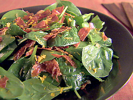 To serve, put the spinach in a large bowl. Toss with enough of the vinaigrette to coat the spinach. Sprinkle with the crisp prosciutto crumbles, toss again, and serve.