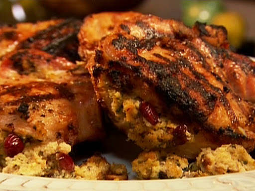 Season the pork chops with salt and pepper. Stuff the chop with about 1/2 cup of stuffing. Use toothpicks to help seal the chops. Grill the chops for 5 to 7 minutes per side. Internal temperature should be 145 degrees F. Allow chop to rest for 5 minutes before serving.
