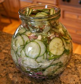 Thinly slice cucumbers and onion. Place vegetables in a medium-size storage container. Mix all other ingredients together and pour over vegetables. Cover and refrigerate (stirring occasionally) for at least three hours.