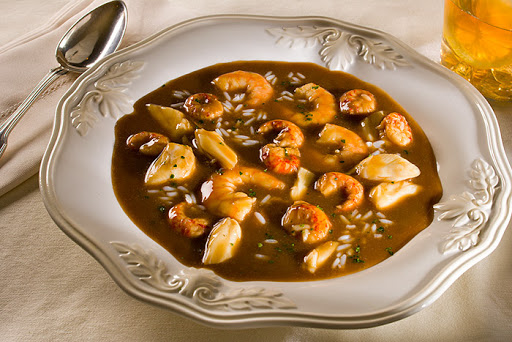 2. To the roux-stock mixture, add seafood seasoning, green pepper, onion, celery, bay leaves, parsley, salt, pepper, tomato sauce, Tabasco and Worchestershire sauce; simmer 2 1/2 hours on low heat. For the last 30 minutes add okra. Then add crab meat, shrimp and crab claws with green onions and simmer 15 minutes more. Serve over rice.
