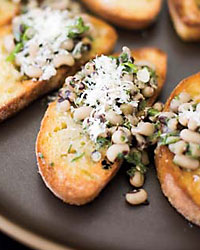 Growing up in a large family of mixed heritage in the South, it seemed only natural to make things up as we went along," says Ryan Hardy. "My mother, a Yankee, insisted that it was good luck to have black-eyed peas on New Year's Day and she'd save the bones from country ham hunks just for that day." Hardy, who has childhood memories of black-eyed peas simmering on the front burner (and collards on the back burner), has adapted the recipe over the years; he now serves the hearty peas with garlic-rubbed toasts and garnishes them with generous amounts of freshly grated Parmigiano-Reggiano.