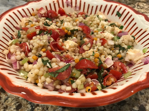In a large bowl, combine the cooled couscous with the red onion, garlic, celery, tomatoes, basil, parmesan, mozzarella, olive oil and vinegar. Stir to combine, then season with salt and black pepper. The salad can be served immediately, but the flavors improve if it is allowed to sit for 30 minutes.